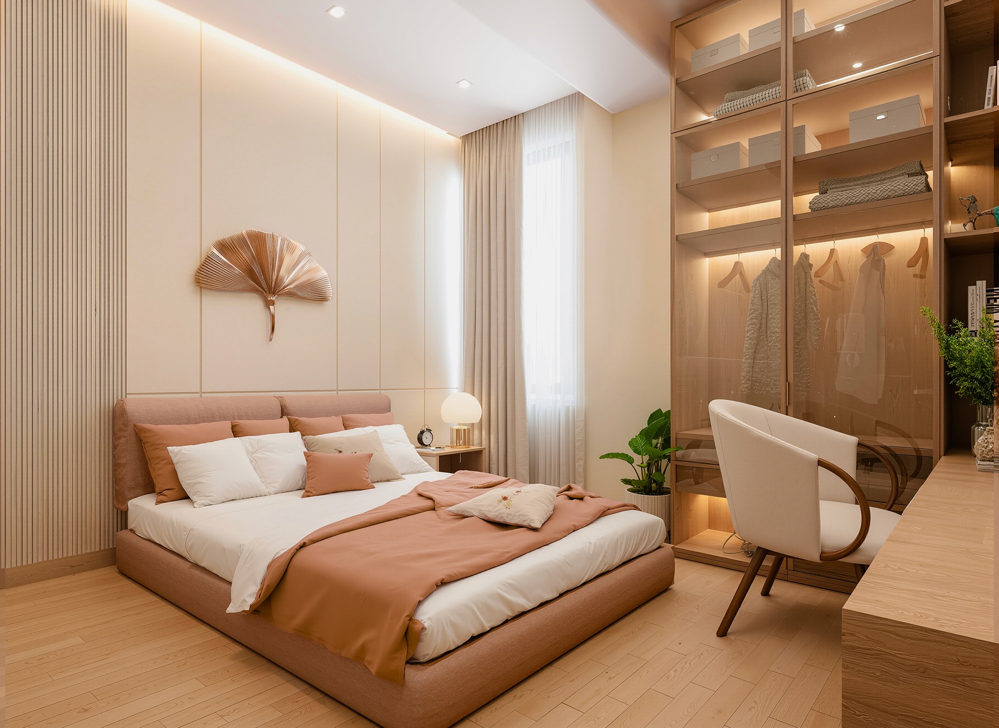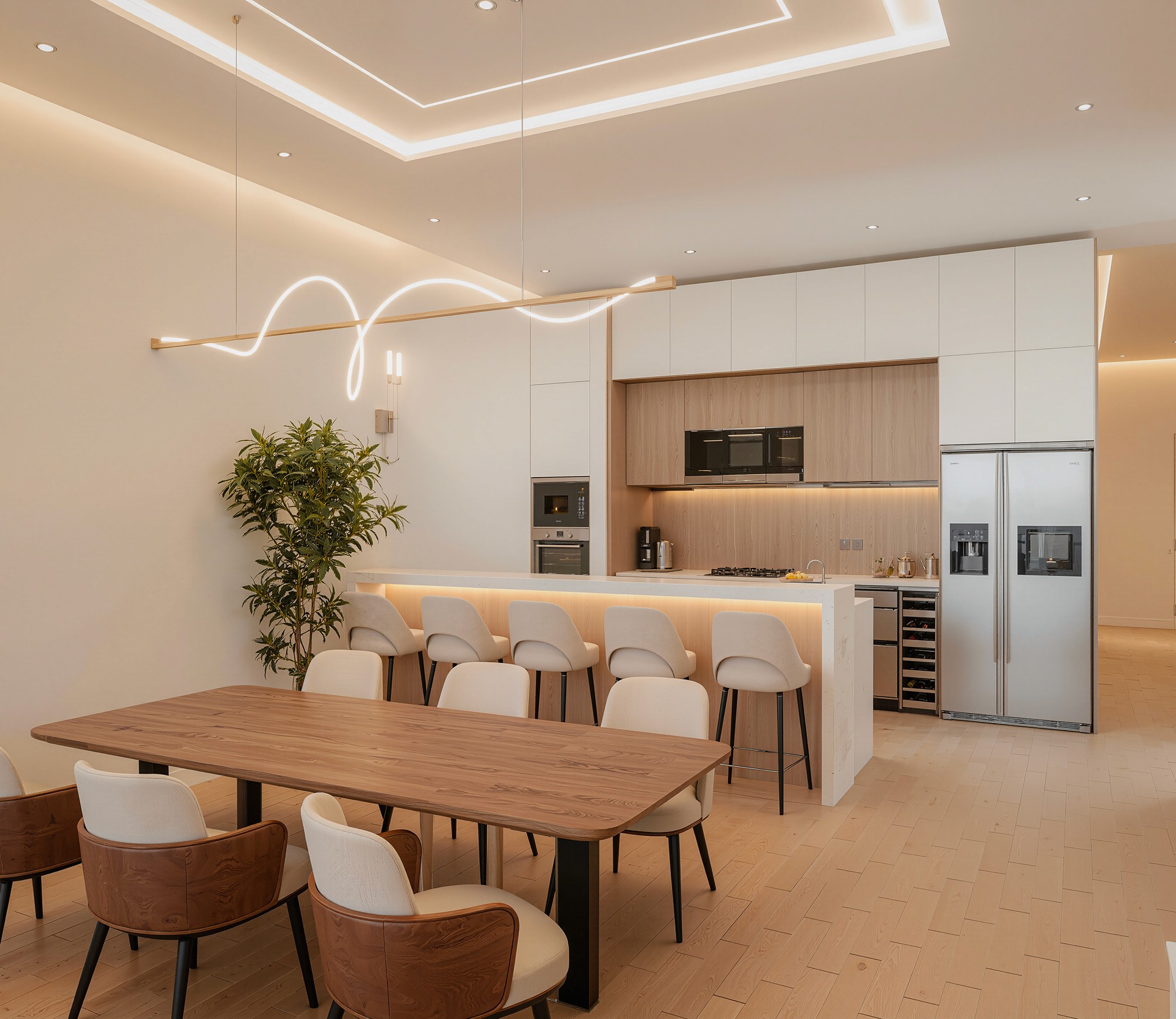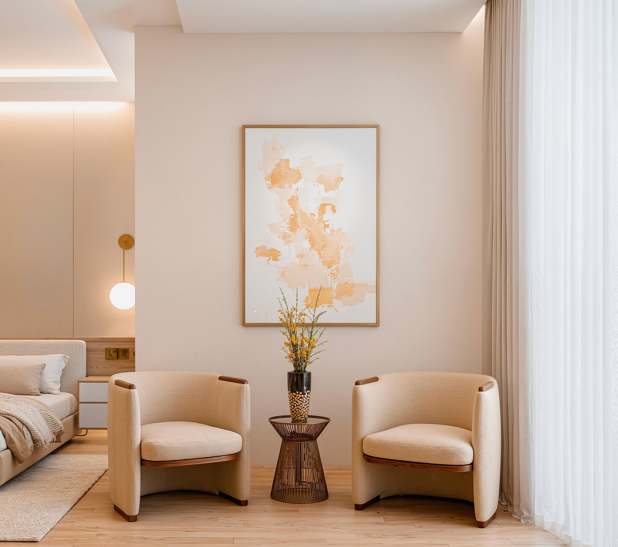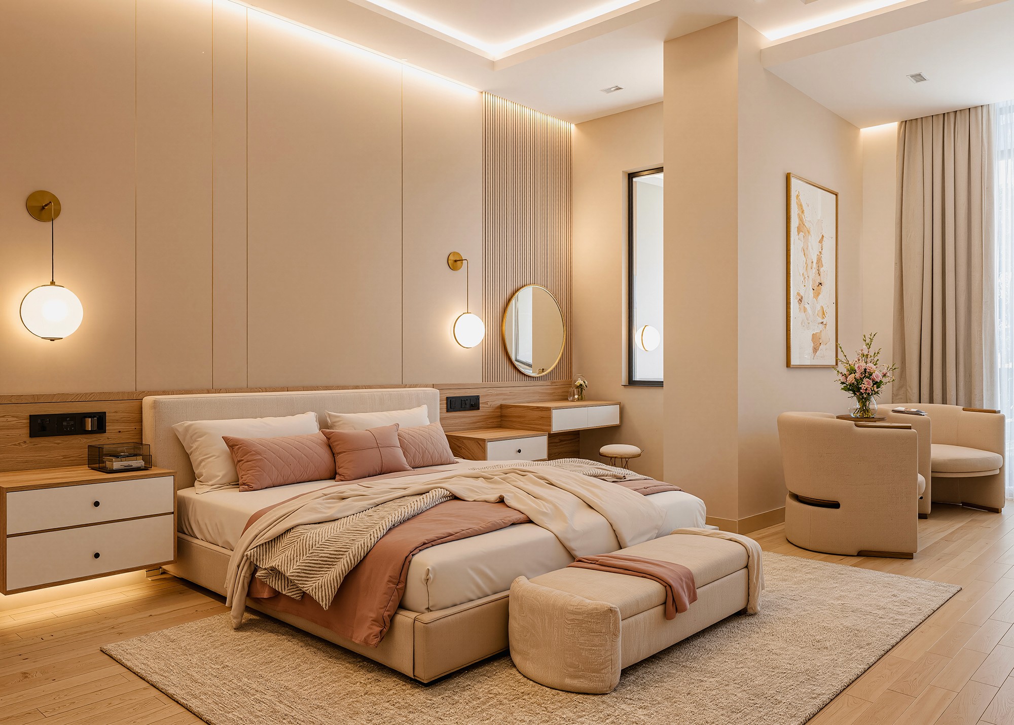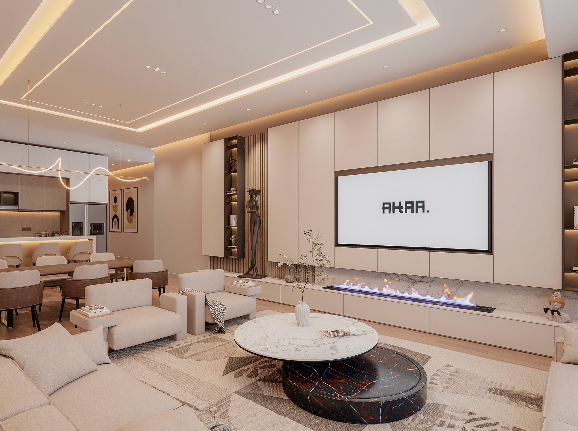 Ethiopian-Japandi Fusion Apartment Interior This apartment interior blends Ethiopian cultural warmth with Japandi minimalism. Natural wood textures, soft lighting, and warm earthy tones create a calm, welcoming atmosphere. The layout features plush seating, layered curtains inspired by traditional Ethiopian fabrics, and a marble dining table paired with blush-toned chairs. Clean lines, subtle decor, and organic elements tie the space together, offering a balanced and elegant living experience.